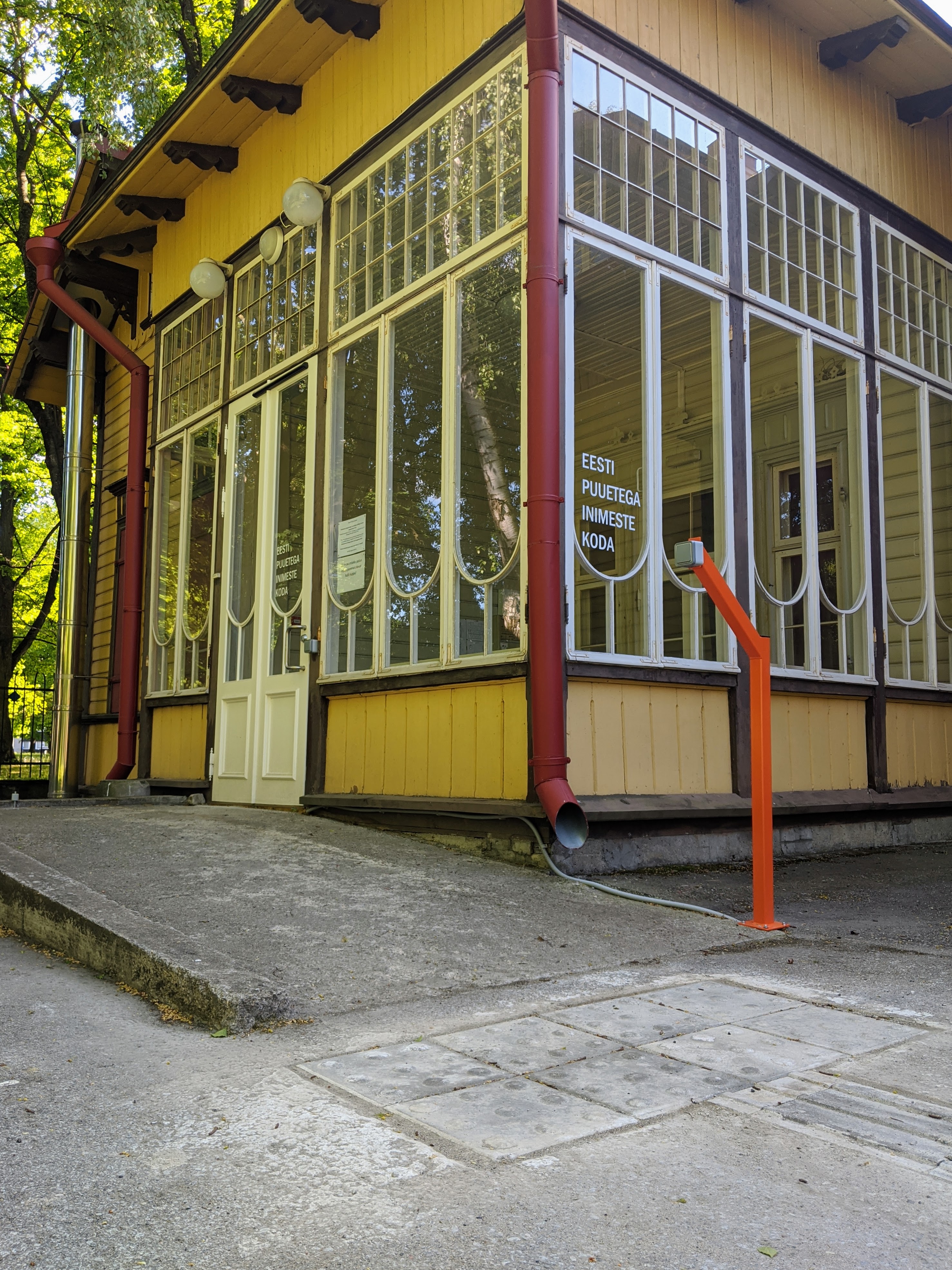 | Majja sissepääs hoovi poolt, maja hoovis parkla. Valge kepiga liiklejate jaoks olemas juhttee, mis juhatab tänavalt hoone hoovis asuva peaukseni. |